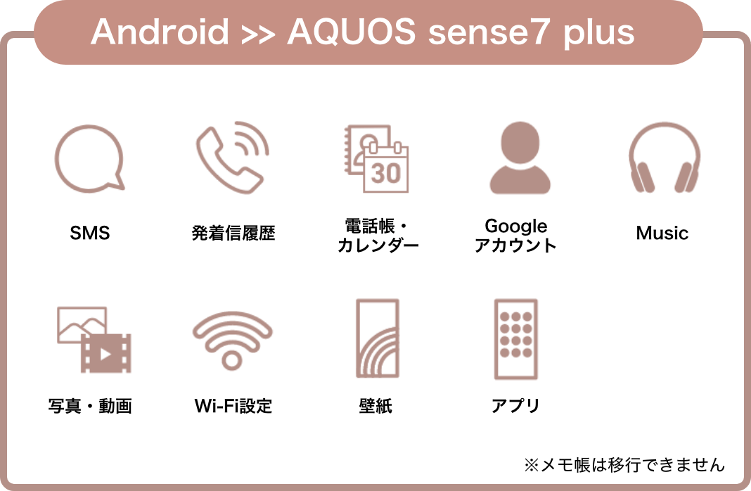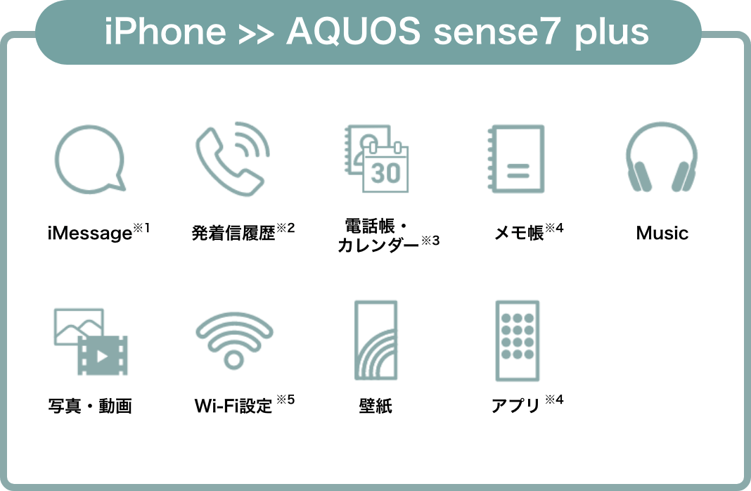 ※1 Googleの「メッセージ」などで表示可能です。※2 iOS13以上かつ、暗号化されている場合です。※3 カレンダーのコピーにはGoogleアカウントが必要です。※4 Googleアカウントが必要です。※5 Wi-Fi設定は保存されますが、パスワードは再度入力いただく必要がございます。