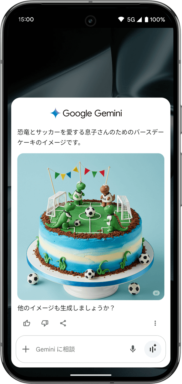 頭に浮かんだアイデアを、Gemini に話しかけたり、チャットするだけで、Google が提供する最高品質のテキスト画像変換モデル「Imagen 3」を使って、細部まで鮮やかな、実物さながらの魅力的な画像を生成できます。複雑なソフトウェアを使わずに、アイデアをかたちにします。
