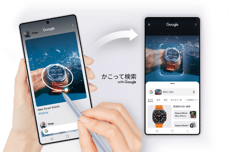 SNSでも、動画を視聴しているときでも、ホームボタンを長押しして、気になるものをくるっと丸でかこむだけですぐ検索「かこって検索」
