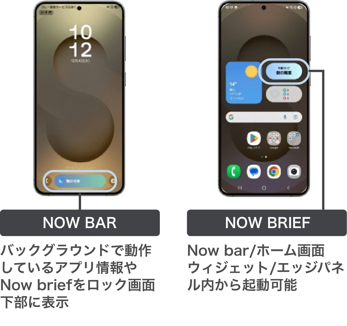 ※ 「Now Brief」機能の使用には、Samsungアカウントへのログインが必要です。サービスの利用可否は、国や地域、言語、デバイスモデル、アプリによって異なる場合があります。状況に応じたルーチンの提案でPersonal Data Engineを使うには、モードとルーチンを有効にする必要があります。写真、動画、音声ファイル、カレンダーのイベントなどのアクセス権限に同意する必要があります。公開の範囲のポリシーによっては、モーメントが表示されない場合があります。モーメントが提供する写真の説明は、ユーザーの意図と異なる場合があります。カレンダーの通知は、Samsungの「カレンダー」アプリをインストールし、Androidのカレンダーデータベースを利用するカレンダーアプリに対応している場合のみ利用できます。クーポンの通知は、「Samsung Wallet」アプリにクーポンの期限が追加されている場合のみ利用可能です。エナジースコアを確認するには、Samsung Galaxy WatchまたはSamsung Galaxy Ringで計測した健康データを「Samsung Health」アプリとの同期が必要です。一般的なウェルネス・フィットネスとしての使用のみを目的としており、睡眠障害や疾患の検出、診断、治療での使用を目的としたものではありません。測定値は、個人的な参考情報としてご使用ください。医療的なアドバイスは、医療専門家にご相談ください。