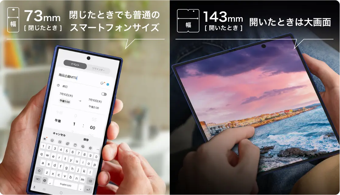 閉じると約6.5インチのスマートフォンサイズのディスプレイでチャットやメール、通話など、毎日使うさまざまなシーンに最適。開けば約8.0インチの超大画面。端まで広がる全面ディスプレイでゲームやマルチタスクを快適に使いこなせる。