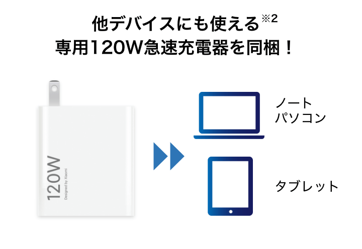 ※1 同梱の充電器利用、画面消灯・充電速度のブースト設定時。 2~100%までの最短充電時間。使用環境等により変動。