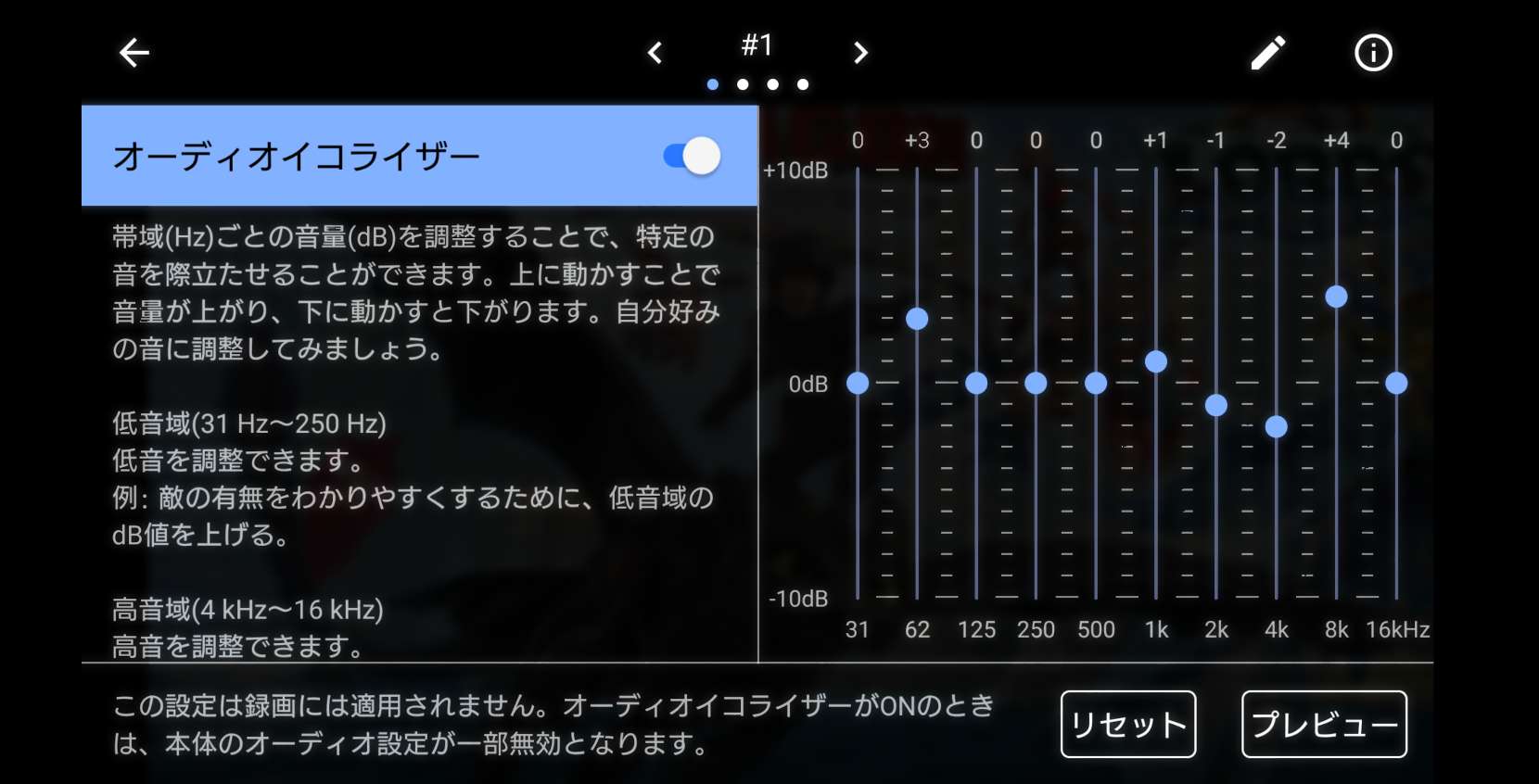 オーディオイコライザ―敵の足音や銃声などゲームに重要な音を強調するなどカスタマイズできる。