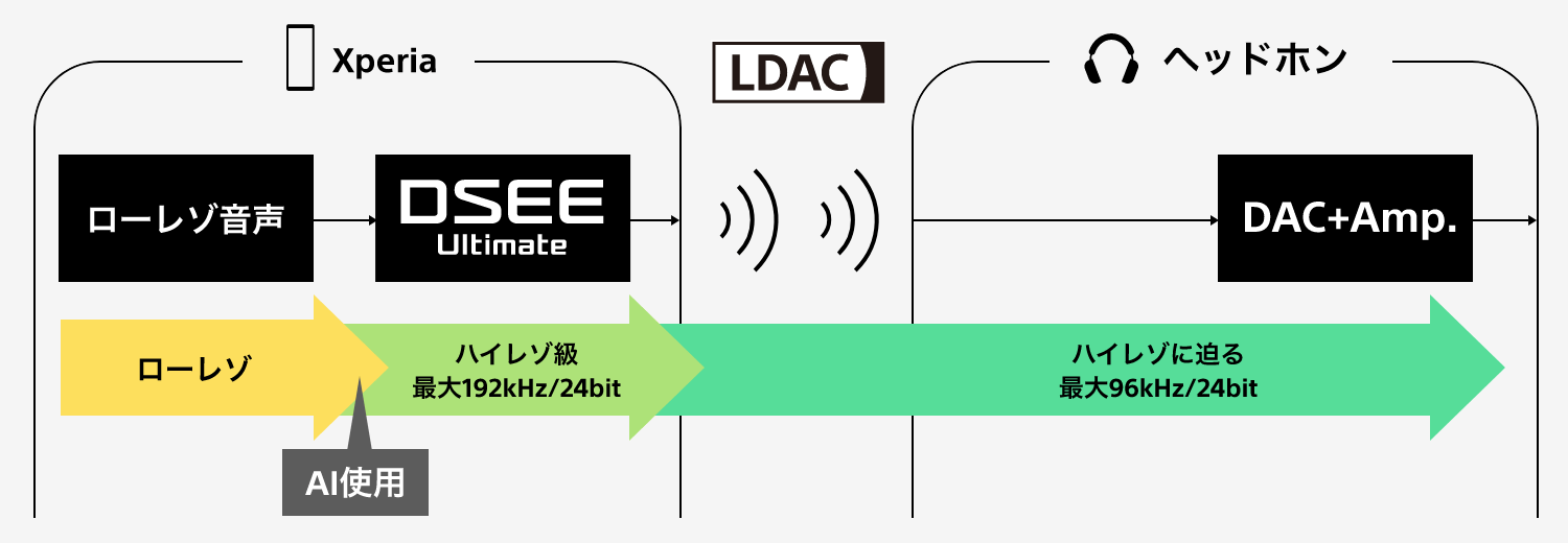 *2 DSEE Ultimateの設定ON時に有効です。ハイレゾワイヤレスは、LDAC対応のスピーカー(別売)やヘッドホン(別売)が必要です。LDACの転送速度990kbpsで伝送する場合にお楽しみいただけます。ハイレゾコンテンツやハイレゾ相当の音質を楽しむには、ハイレゾ対応ヘッドホン(別売)が必要です。