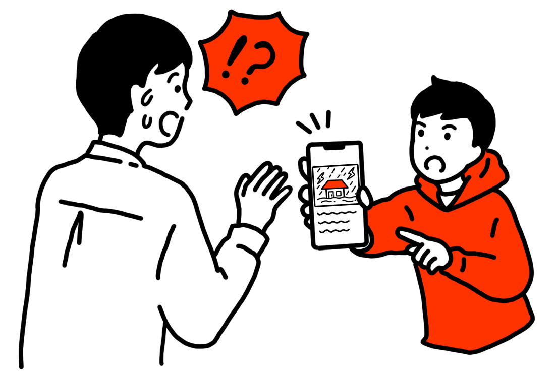 台風のさなか、SNSを見ていた子どもが、「○○川が氾濫してる!みんなに知らせなきゃ」と言ってその画像を見せてくれました。そのとき、親がとる行動として正しいものを選んでください。