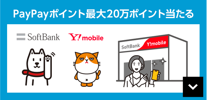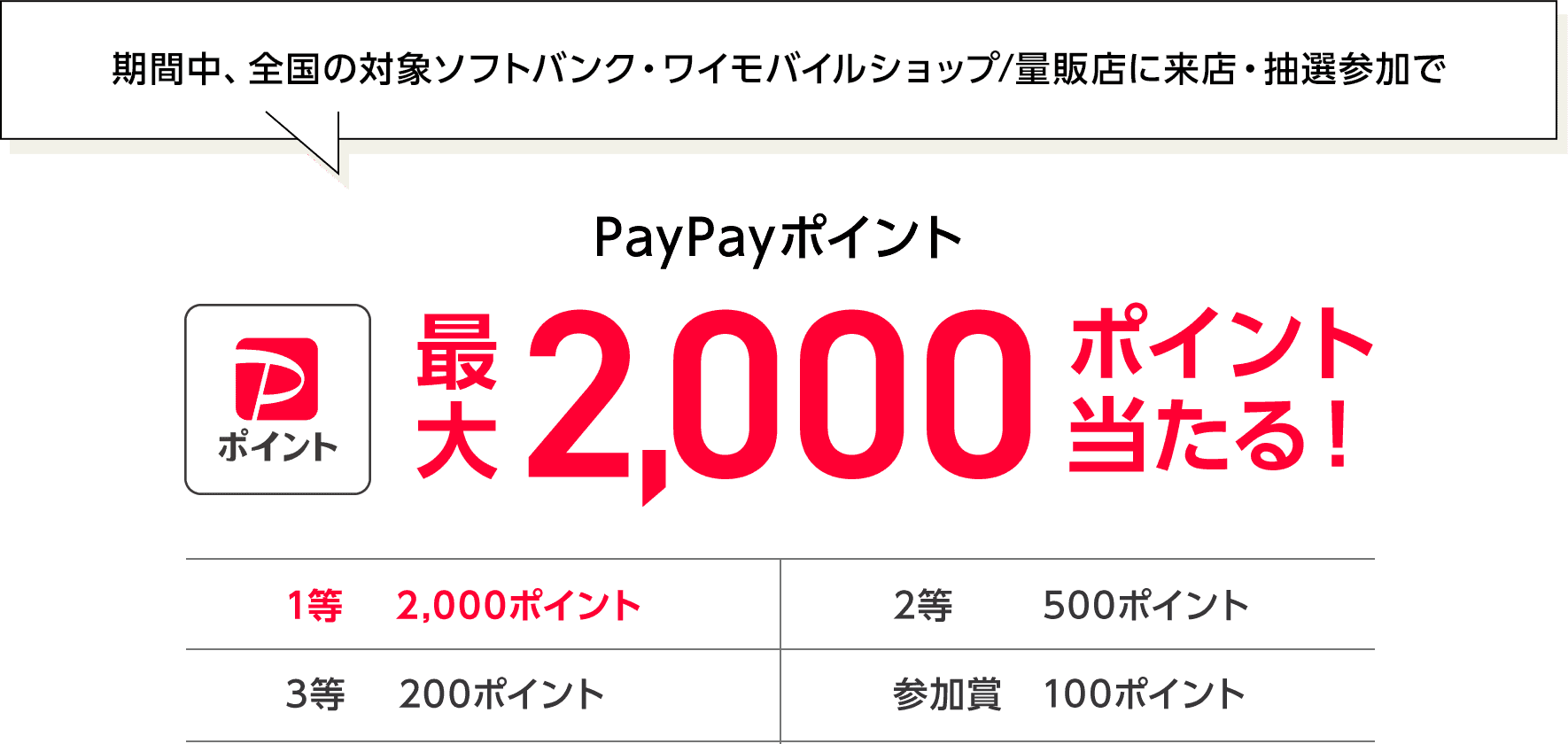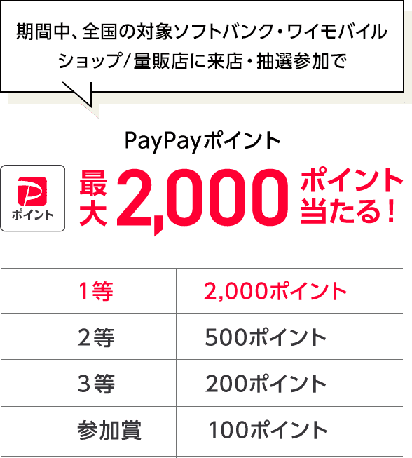 さらに、全国の対象ソフトバンク※2・ワイモバイルショップ/家電量販店へのご来店&抽選に参加で最大2,000ポイントのPayPayポイントが当たります。