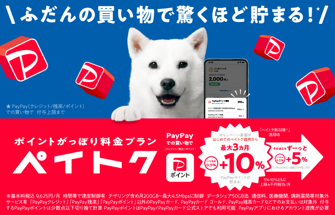 - 時間帯により速度制御の場合あり。ペイトク無制限プランはテザリングと合計200GB/月超の場合、通常利用に影響のない範囲(最大4.5Mbps)に速度制御。データシェアは50GBまで。