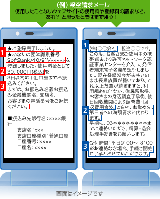 使用した覚えのないウェブサイトの利用料などの、支払い要求をしたりするメールが「架空請求メール」。心あたりのない要求メールに関しては無視をし、業者 に対して返信・返答をしないでください。また、ハガキによる架空請求の被害もでています。トラブルに巻き込まれた場合は、消費生活センターや警察などにご相談ください。また、最近では、架空請求業者が訴訟制度を悪用し実際に訴訟をおこない、裁判所から訴状や呼び出し状が届いたりするケースもありますので、ご注意ください。