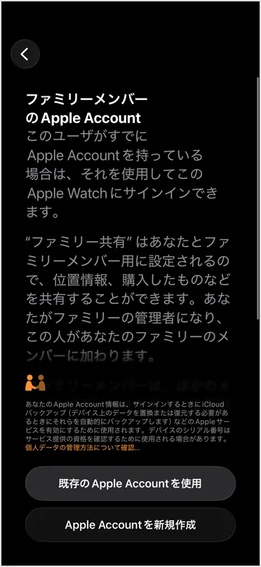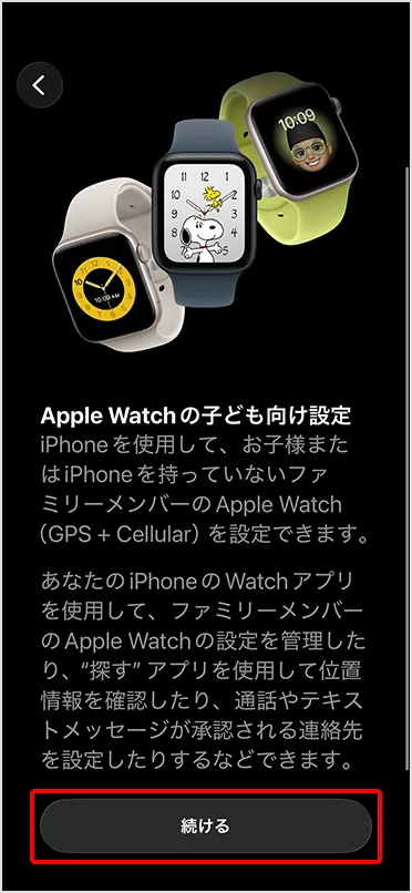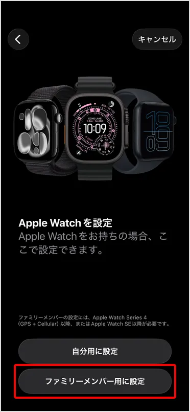 - 本サービスをご利用いただくには、iPhone とApple Watch を「ファミリーメンバー用に設定」を選択し、ペアリングする必要があります。「自分用に設定」を選択した場合はご利用いただけません。