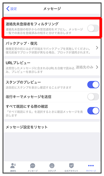 「連絡先未登録者をフィルタリング」の
