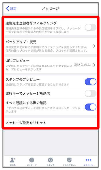 | スタンプのプレビュー | 送信前にスタンプを表示して確認するかどうかを設定します。 |