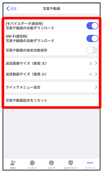 | [モバイルデータ通信時]写真や動画の自動ダウンロード | モバイルデータ通信時に受信した写真や動画を自動でダウンロードするかどうかを設定します。 |