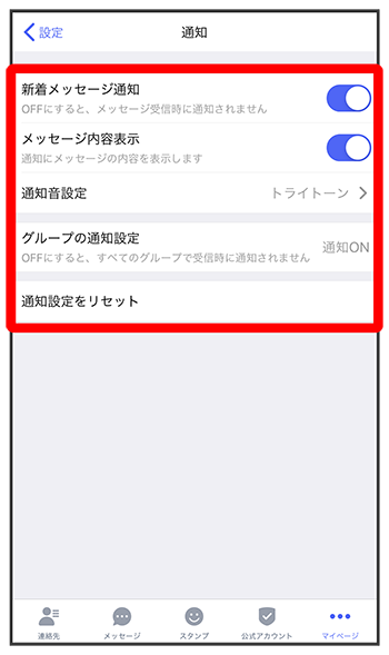 | メッセージ内容表示 | 受信通知にメッセージの内容を表示するかどうかを設定します。 |