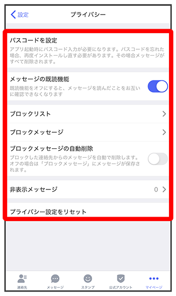 | ブロックメッセージの自動削除 | ブロックした連絡先からのメッセージを自動で削除するかどうかを設定します。 |