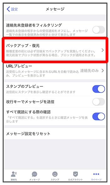 - バックアップにブロックしたメッセージを含める場合は、「ブロックメッセージを含める」を有効(