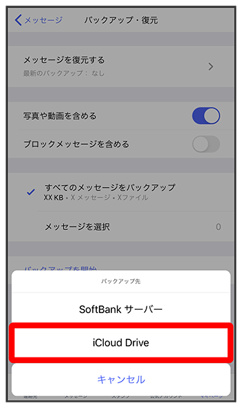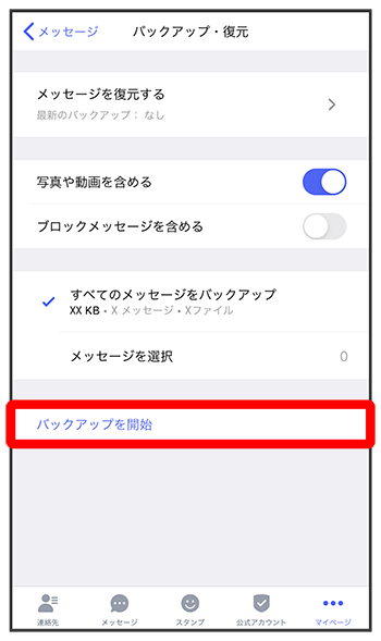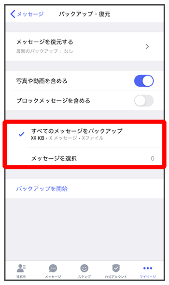 表示)にしてください。 - をタップしたときは、バックアップしたいメッセージを選択をタップしてください。