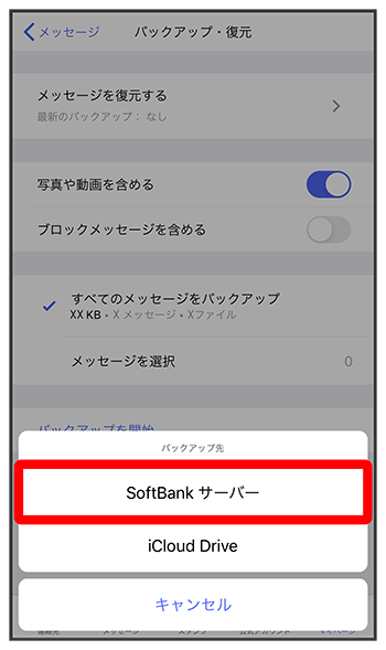 - 【赤】SoftBankサーバー上に以前のバックアップデータがある場合は上書きされます。