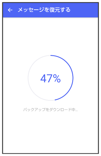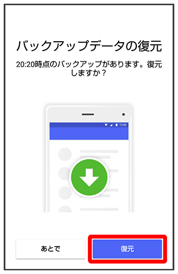 - この画面が表示されなかった場合は「メッセージデータを内部ストレージ/SDカードから復元する」を参照して、バックアップしたデータを復元してください。