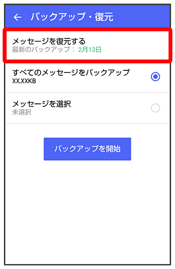 - データがバックアップされていることを確認するため、メッセージ復元メニューからバックアップデータを確認します。