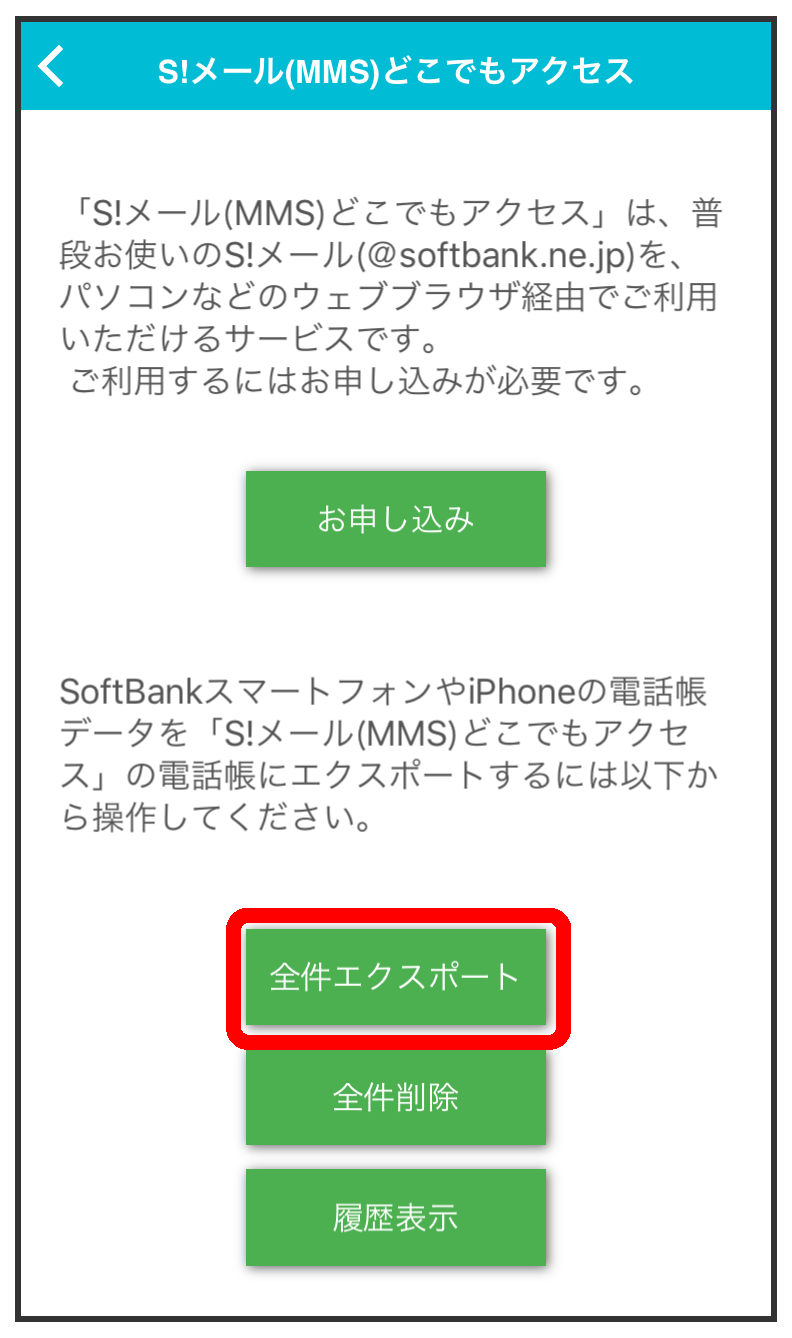 「S!メール(MMS)どこでもアクセス」利用画面でMy SoftBankの電話番号とパスワードを入力エクスポートの履歴を確認する