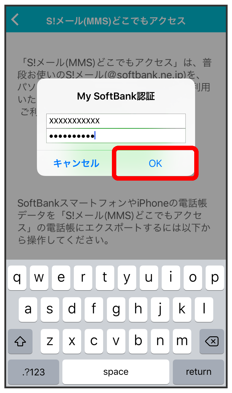 - 初めてエクスポートするときは、が表示されます。「S!メール(MMS)どこでもアクセス」にお申し込みが必要なときは、をタップし、画面の指示に従って操作してください。