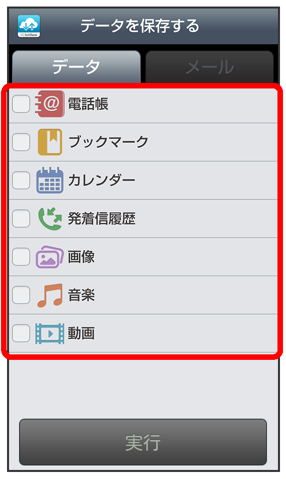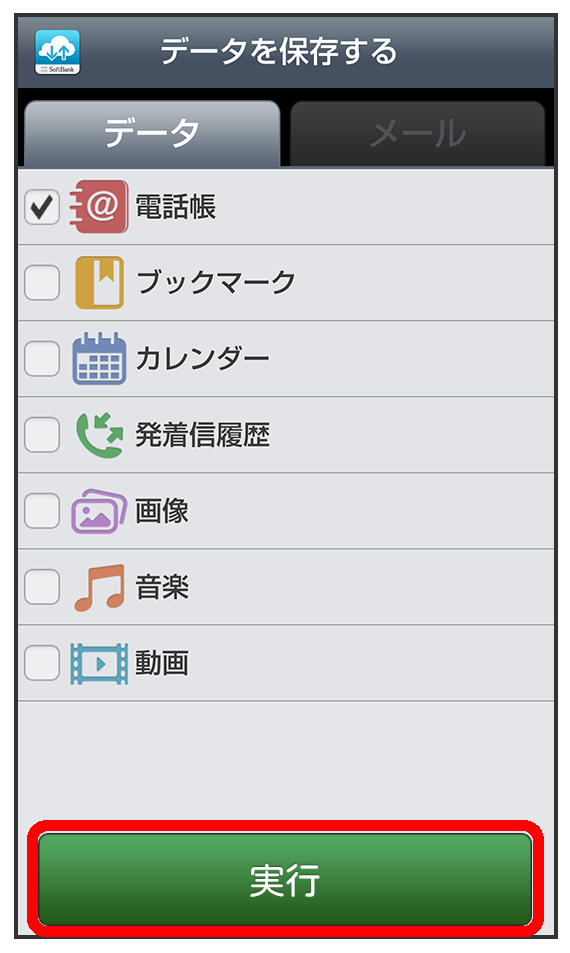 本体の電話帳データ/ブックマークデータ/カレンダーデータ/発着信履歴/画像/音楽/動画を、サーバー/SDカードなどに保存します。