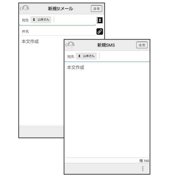 件名の有無や本文の長さなどで、送信時に自動でS!メール/SMSが切り替わります。