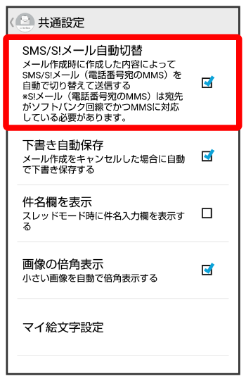 自動でS!メールとSMSを切り替えるかどうかを設定する