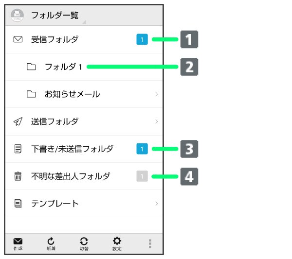 フォルダ一覧モードでは、「受信フォルダ」や「送信フォルダ」、作成したサブフォルダなどに分けてメールを保存します。