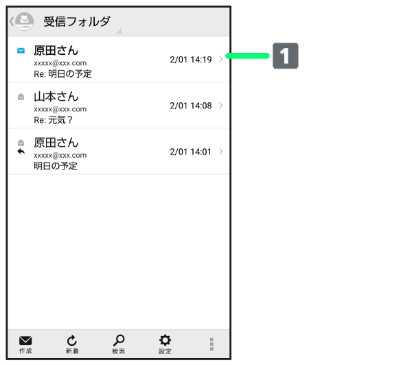 S!メール/SMS一覧画面で対象のメールをロングタッチ移動先のフォルダをタップ- 複数のメールを選択するときは、ロングタッチしたあとに、そのほかの対象のメールの