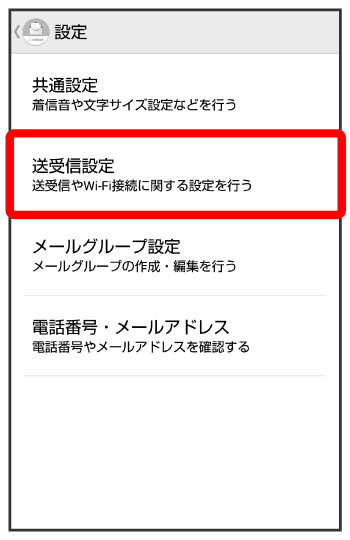 | 受信設定 | S!メール/SMS受信時の設定を行います。S!メールの一部を受信するとき、受信する内容を設定したり、S!メール起動時に自動で新着メールの確認をするかどうかを設定します。 |