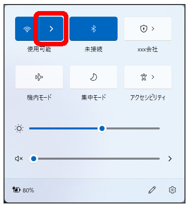 - Wi-Fiアイコンが青色ではなく白色の場合は、Wi-FiがOFFになっています。Wi-FiアイコンをクリックしてONに変更してください。