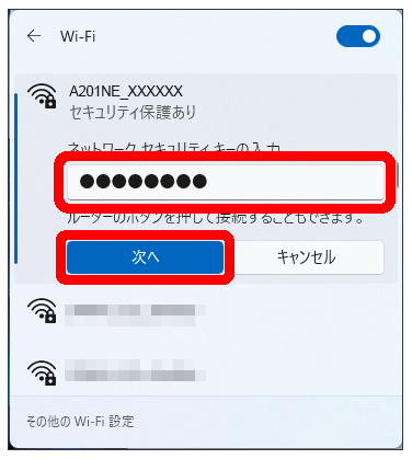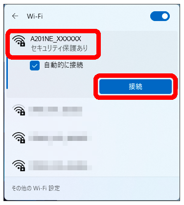 を約3秒長押しして本機の休止状態を解除してください。休止状態を解除して確認しても、ネットワーク名(SSID)が表示されない場合には、パソコンにて、ネットワーク名(SSID)とパスワード(暗号化キー)を手動で追加して接続をお試しください。 - 本機の認証方式の設定によっては、セキュリティに関するメッセージが表示される可能性があります。その場合は認証方式の設定を変更して接続してください。