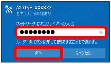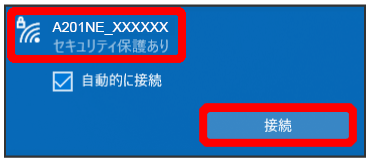 を約3秒長押しして本機の休止状態を解除してください。休止状態を解除して確認しても、ネットワーク名(SSID)が表示されない場合には、パソコンにて、ネットワーク名(SSID)とパスワード(暗号化キー)を手動で追加して接続をお試しください。 - 本機の認証方式の設定によっては、セキュリティに関するメッセージが表示される可能性があります。その場合は認証方式の設定を変更して接続してください。