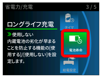 - ご使用開始時、最初に電源を入れたとき(または初期化したあと)に、「ご利用にあたってのお願い」(ロングライフ充電)画面で(使用する)または(使用しない)を選択できます。