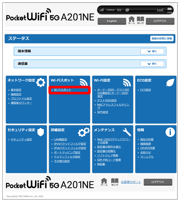 - Wi-Fiスポット機能がONの場合、次の2つの機能が使用できません。