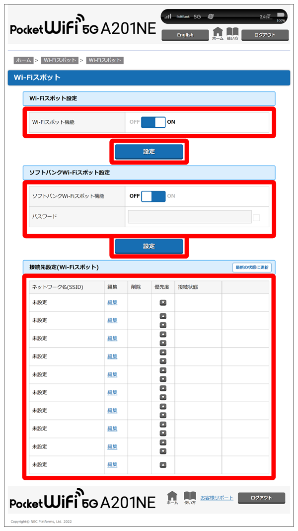 | ソフトバンクWi-Fiスポット機能 | ソフトバンクWi-Fiスポットを利用する場合は、ONにします。 初期設定:OFF |