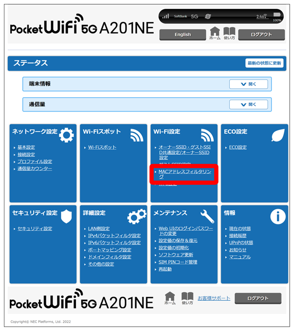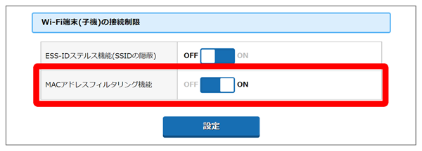 「Wi-Fi端末(子機)の接続制限」の「MACアドレスフィルタリング機能」を