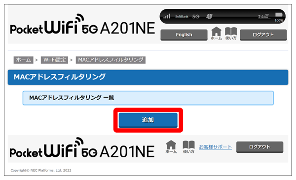 MACアドレスフィルタリングを有効にすると、接続を許可するWi-Fi端末を指定できます。