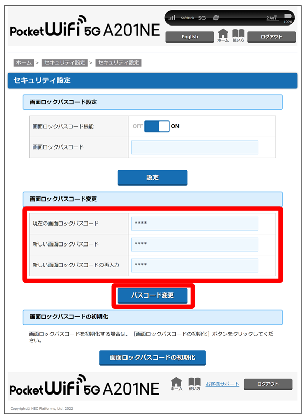 画面ロックパスコード変更の各項目を入力