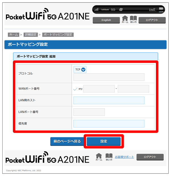 - ポートマッピングを設定するWi-Fi端末は、DHCPサーバ機能によりIPアドレスが自動的に割り当てられないように、IPアドレスを固定しておいてください。