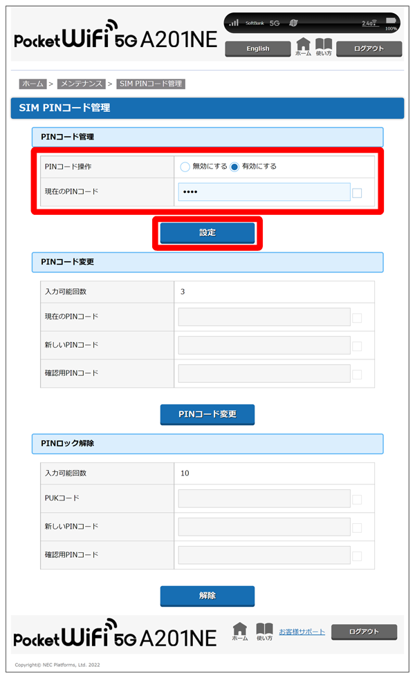 「PINコード操作」をにチェック「現在のPINコード」を入力