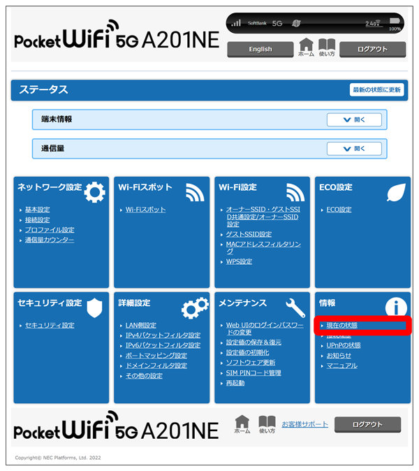 | 使用チャネル(5GHz) | Wi-Fi(5GHz)で使用しているチャネルを表示します。 |