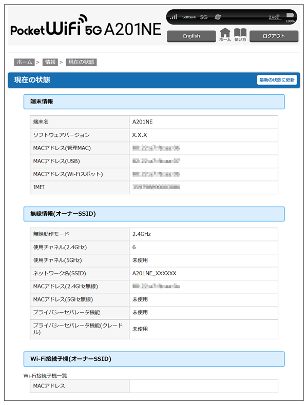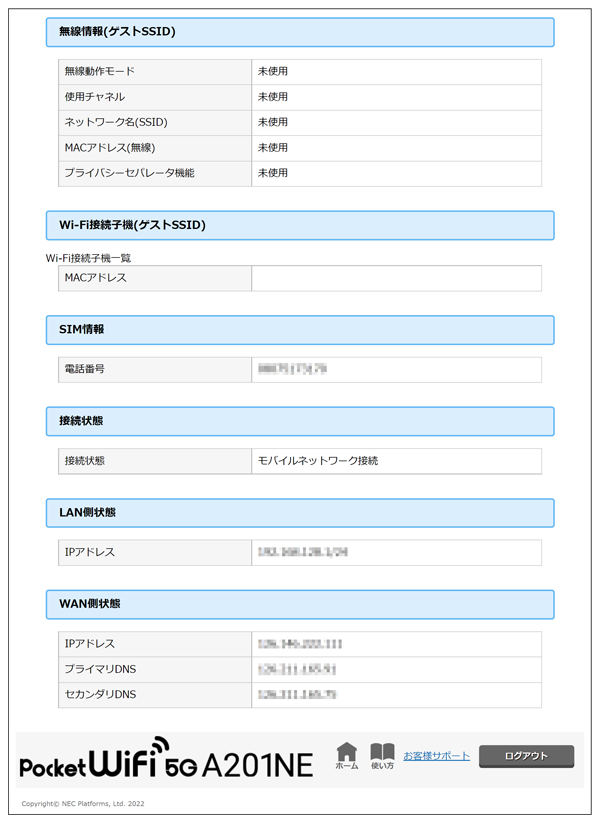 | MACアドレス | Wi-Fi接続子機(ゲストSSID)のMACアドレスを表示します。 |
