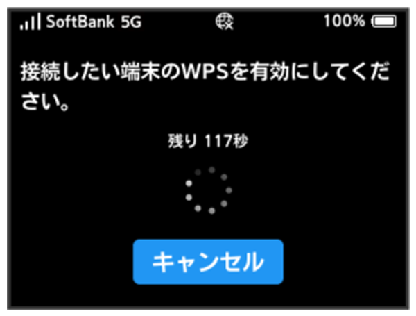 次の画面が表示されている間(120秒以内)に、アクセスポイント端末でWPS機能の接続設定を行う