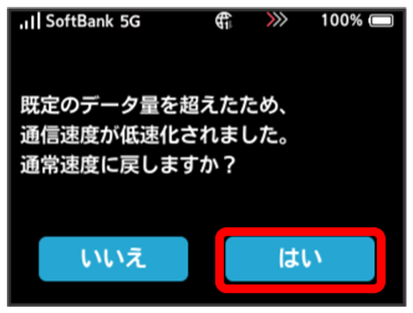 通信速度の低速化の開始を通知するポップアップ画面が表示された場合に、低速化を解除して通常速度に戻すお申し込みができます。