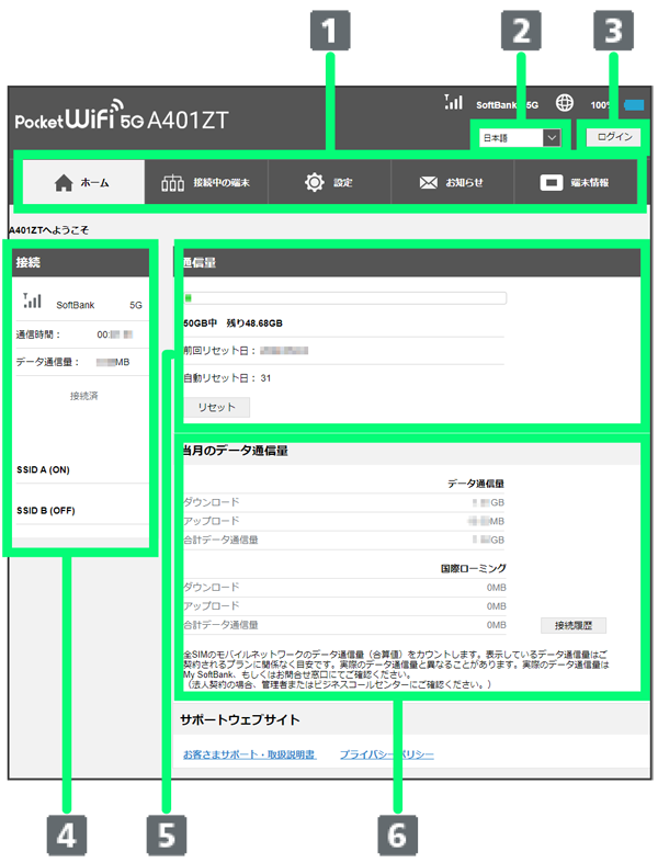 | 接続情報 | 受信レベルのアイコン: モバイルネットワークの受信レベルをアイコンで表示します。 ネットワークオペレーター表示: 接続中のネットワークオペレーター名を表示します。 ネットワークの種類: 5G/4G/LTEのいずれかを表示します。 通信時間: 接続してから現在までの通信時間を表示します。 データ通信量: 接続してから現在までの送信/受信データ通信量を表示します。 接続ボタン: ネットワークへの自動接続が失敗した場合に、手動で接続します。 SSID A: Wi-Fi名(SSID A)に接続中の機器の端末名を表示します。 SSID B: Wi-Fi名(SSID B)に接続中の機器の端末名を表示します。マルチSSID機能(SSID B)がONの場合にのみ表示されます。 |