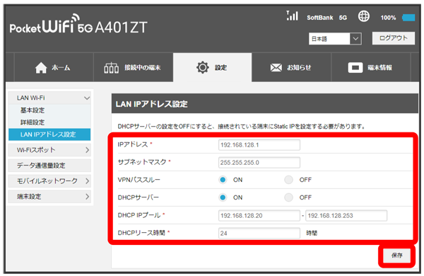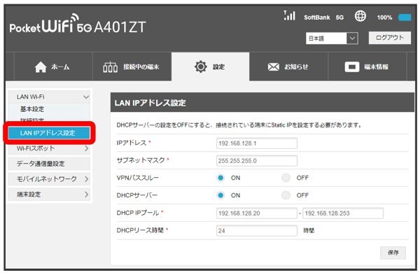 Wi-Fiスポットのデフォルトゲートウェイを変更できない場合は、本機のLAN IPアドレスを変更できます (例:192.168.127.1に変更)。