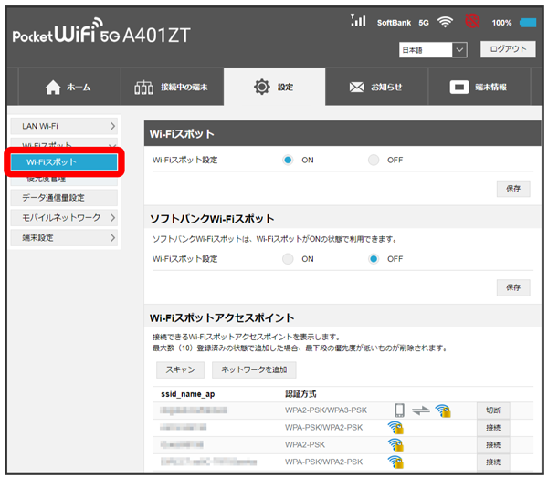 「Wi-Fiスポット設定」のを確認