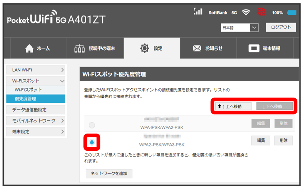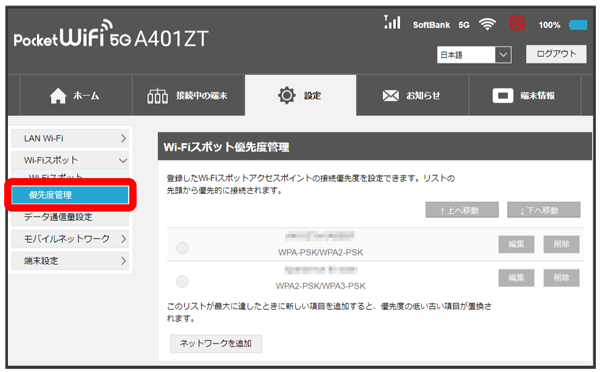 接続先に優先順位を設定し、優先的に接続するアクセスポイントを指定できます。